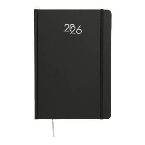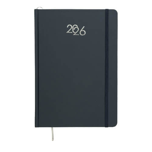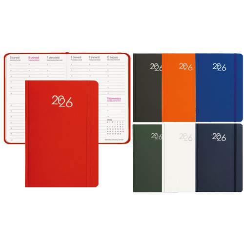 Agenda settimanale con copertina rigida in cartoncino laminato, dallo stile essenziale e professionale, ideale per una pianificazione ordinata delle attività settimanali durante tutto l’anno.