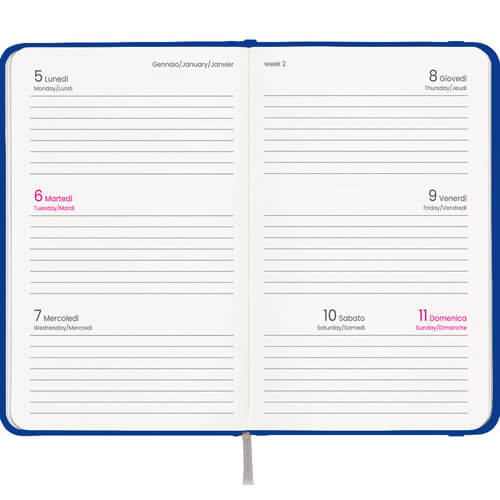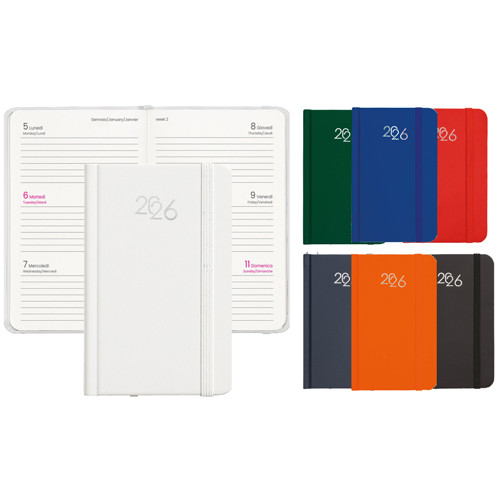 Agenda tascabile settimanale con copertina rigida in cartoncino laminato, compatta e funzionale, perfetta per avere sempre con sé l’organizzazione della settimana.