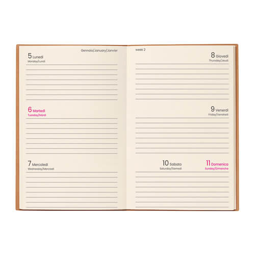 Agenda Settimanale in Cartoncino "Craft" con Copertina Morbida: Questa agenda settimanale, realizzata in cartoncino "craft", presenta una copertina morbida e pagine interne color avorio. Le sue dimensioni compatte la rendono ideale per l'uso quotidiano, combinando praticitĂ e stile in un formato tascabile.
