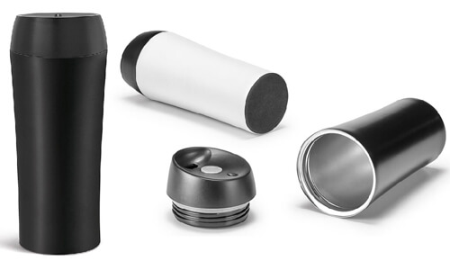 Bicchiere da viaggio in acciaio inossidabile a doppio strato e PP, con coperchio con sistema salvagoccia, base antiscivolo e capacità fino a 470 ml. Fornito in scatola regalo. Dimensione: ø80 x 198 mm - Boîte: 82 x 202 x 82 mm colori: nero, bianco