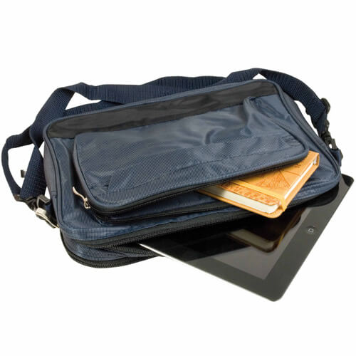 Borsa porta tablet in polyester 420D, con 3 scomparti, tracolla, chiusura con zip, impermeabile e resistente, struttura e colori come da foto. Dimensioni - 28 X 17 X 6 cm. Colore blu