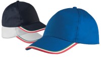 Cappellini promozionali con struttura a 5 pannelli, inserto sul frontino colorato e visiera pre curv...
