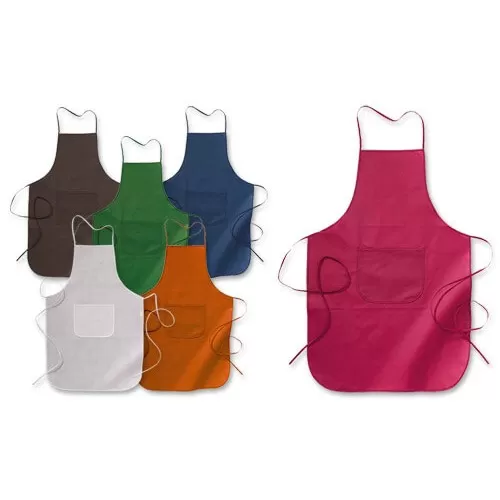 Grembiule, con tasca frontale, materiale TNT 80gr-mq, colori disponibili: bianco, nero, verde, bordeaux, arancio. Dimensioni: 60 x 90 cm. ca.