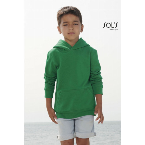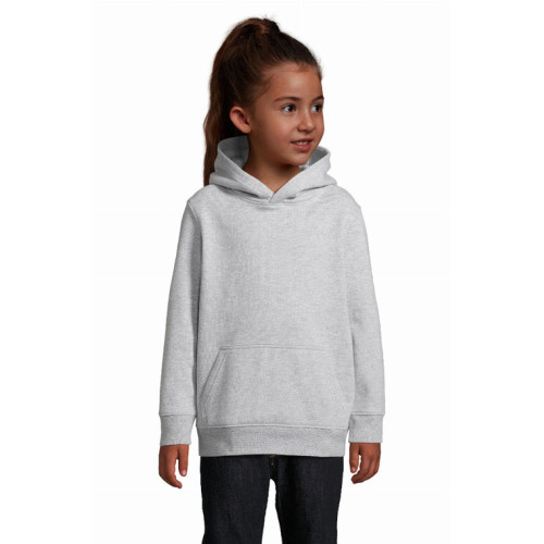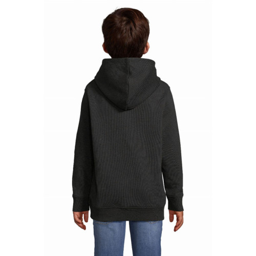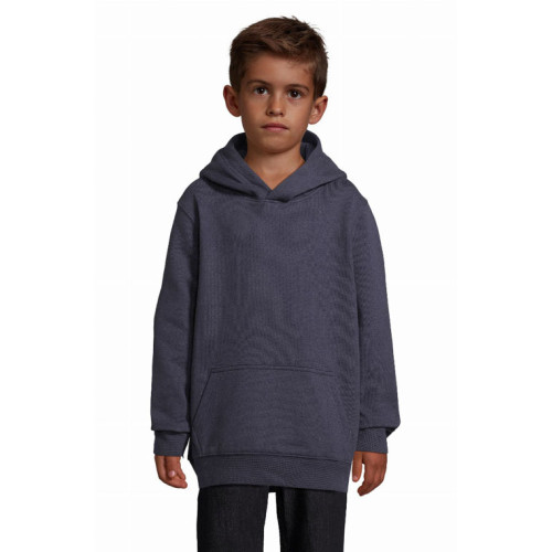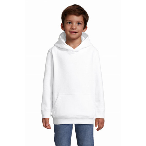 Felpa bambino con cappuccio – garzata 280 - Maniche montate Tagliata e cucita Polsini e fondo del capo a costina 1x1 Tasca a marsupio Cappuccio doppio tessuto Mezzaluna e nastro di rinforzo in jersey sul collo Stile casual