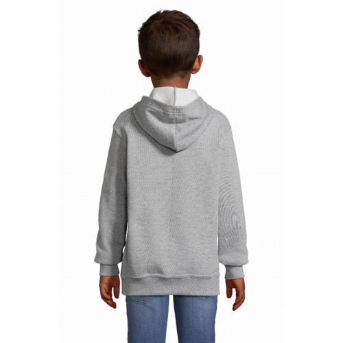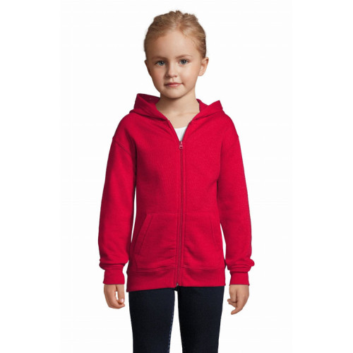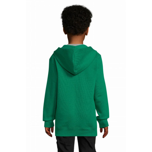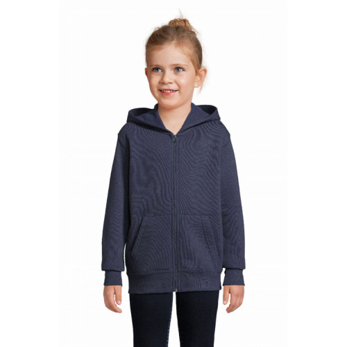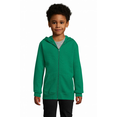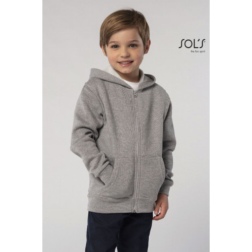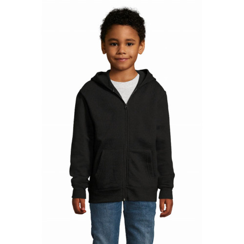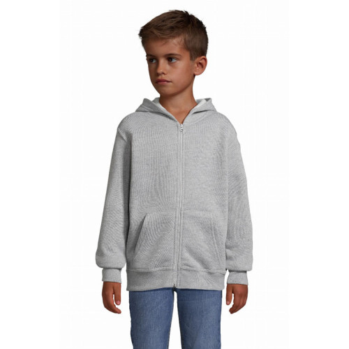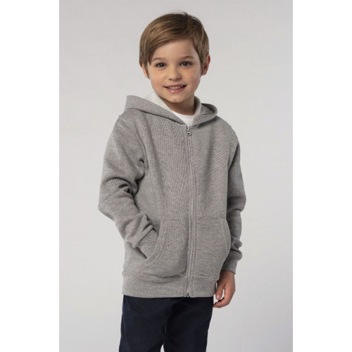 Felpa bambino full zip con cappuccio – Maniche montate 2 tasche a marsupio Cappuccio in tinta Polsini e fondo del capo a costina Tubolare
