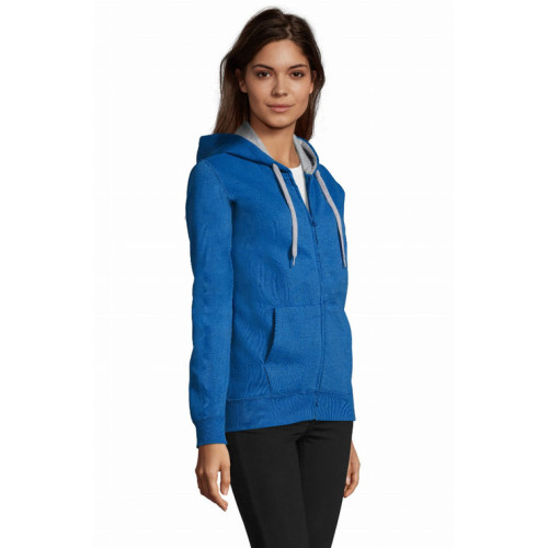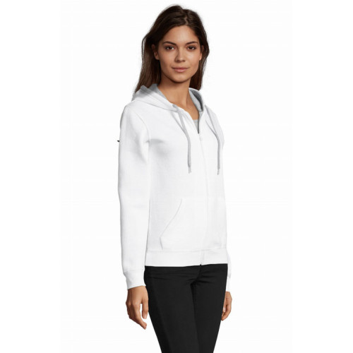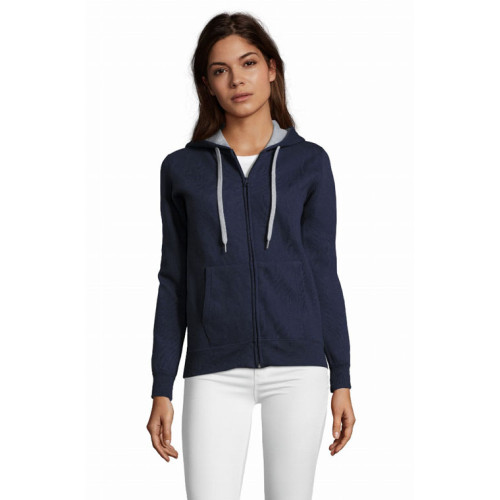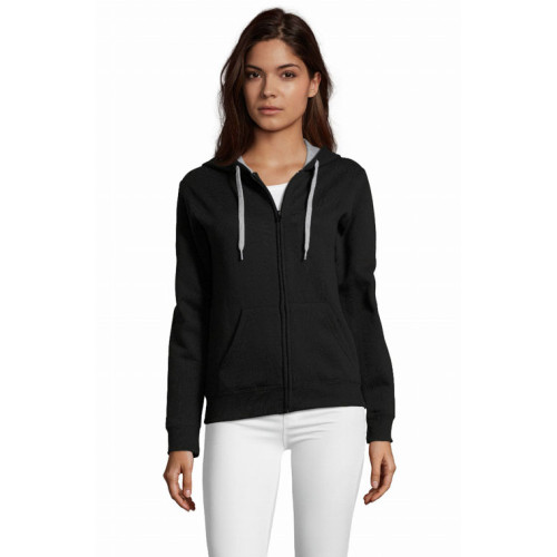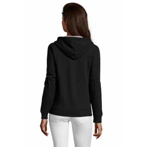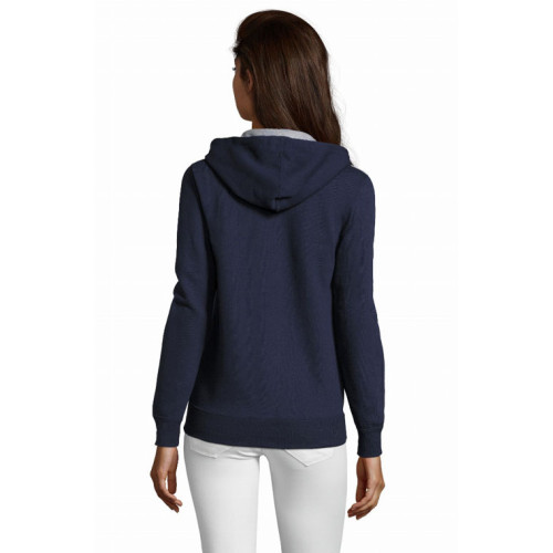 Felpa donna con cappuccio foderato a contrasto – Modello ispirato dal mondo della moda e adattato al settore promozionale. Zip nascosta per consentire la stampa su tutta la superficie anteriore del capo. – Fondo del capo e polsini con elastan Maniche montate 2 tasche a marsupio Cappuccio doppio tessuto a contrasto con cordini Full zip in tinta Punto vita sfiancato Tagliata e cucita