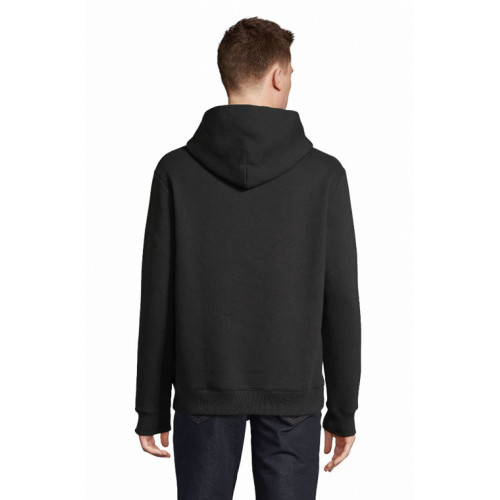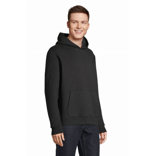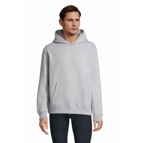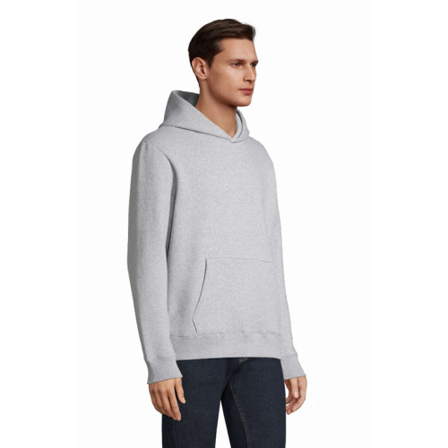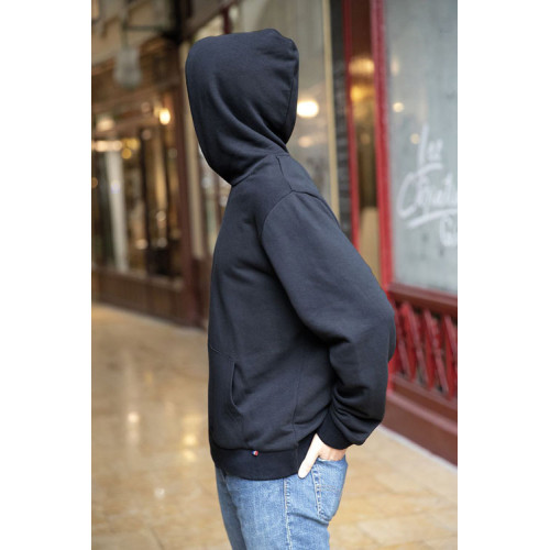 Felpa con cappuccio made in france – Unisex Tagliata e cucita Maniche montate Cappuccio doppio tessuto nello stesso materiale del corpo Polsini e fondo del capo a costina 1x1 con dettagli a contrasto Mezzaluna sul collo Nastro di rinforzo sul collo Dettaglio tricolore sul fondo del capo