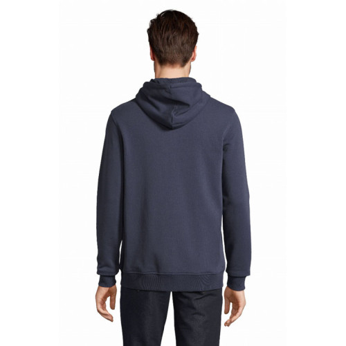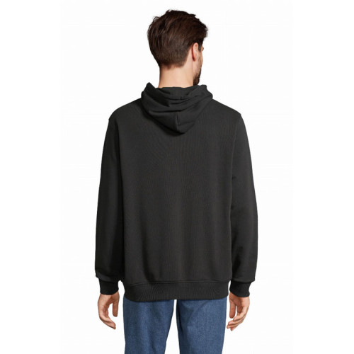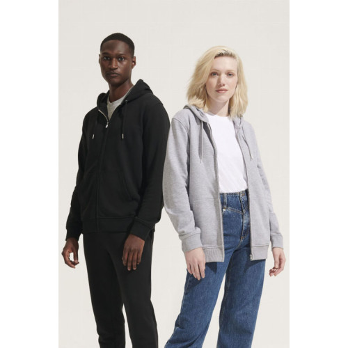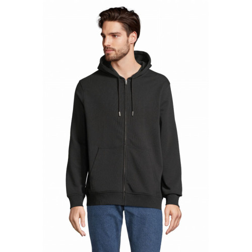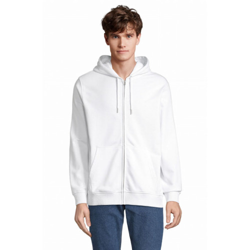 Felpa unisex full zip con cappuccio – terry 320 - Tagliata e cucita Maniche montate Polsini e fondo del capo a costina 2x2 Tasca a marsupio Cappuccio doppio tessuto in jersey Cordino con occhielli e farmacorda in metallo Chiusura centrale con zip nascosta Zip e tirazip in metallo Mezzaluna e nastro di rinforzo in jersey sul collo