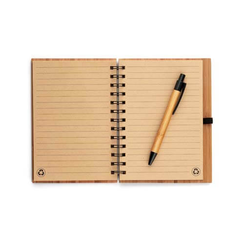 Blocco note in bambù con 140 pagine a righe in carta riciclata.Penna a sfera in bambù inclusa. Dimensione: 135 x 180 mm colori: naturale