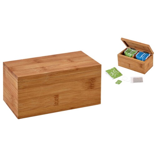 Scatola per il tè in bambù con 2 scomparti. Chiusura a calamita. Include 20 bustine di tè delle Azzorre "Gorreana" (nero e verde). Fornito in scatola di carta kraft. Dimensione: 160 x 87 x 78 mm - Scatola: 166 x 91 x 87 mm colori: naturale