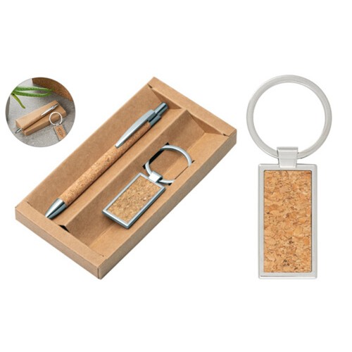 Set di penna a sfera e portachiavi. Penna a sfera NATURA in sughero e alluminio. Portachiavi in sughero e metallo. In scatola regalo. Dimensione: Penna a sfera: ø9 x 139 mm - Portachiavi: 24 x 47 x 3 mm - Scatola: 162 x 83 x 17 mm colori: naturale, la personalizzazione viene eseguita sulla scatola a richiesta sul portachiavi con incisione al laser