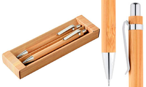 Set con penna a sfera e matita portamina in bambù, fornito con scatola regalo di cartoncino. La matita portamina con grafite di 0.7mm. Dimensione: ø11 x 138 mm - Custodia: 171 x 53 x 23 mm colori: naturale