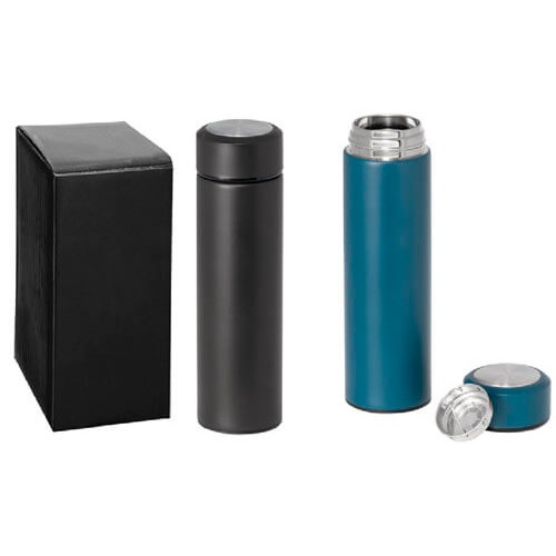 Thermos in acciaio inossidabile a doppio strato, infusore per il tè e capacità fino a 470 ml. Fornito in scatola regalo. Dimensione: ø65 x 230 mm - Caja: 74 x 235 x 74 mm colori: nero, blu