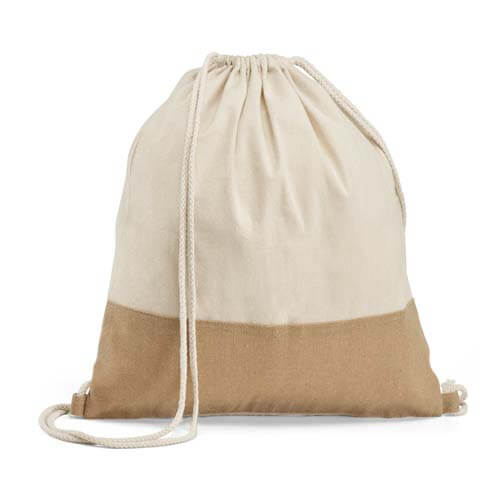 Zaino a sacca in 100% cotone (160 g/m²) con dettagli in iuta, un accessorio naturale ed ecologico, ideale per eventi, shopping e promozioni sostenibili. Grazie ai materiali di alta qualità , combina resistenza e stile in un design minimalista. Scegli uno zaino naturale e sostenibile, perfetto per ogni occasione con un tocco di eleganza ecologica.