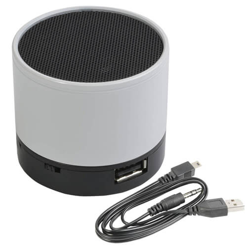 Speaker bluetooth con microfono per chiamate in vivavoce, con cavo usb, materiale metallo batterie incluse, colori disponibili: nero, bianco. Dimensioni: 5,7 X 5,1 cm.