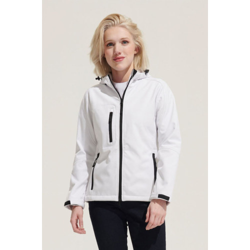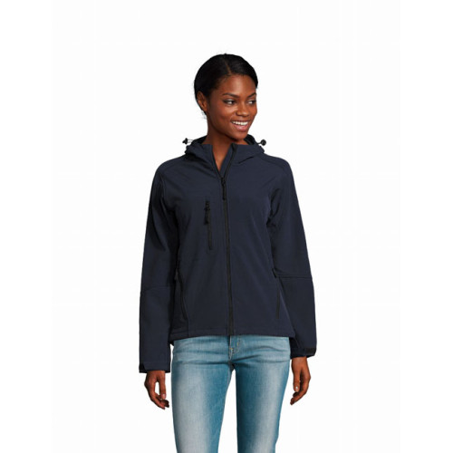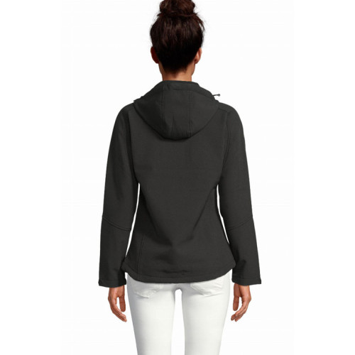 Giacca donna softshell con cappuccio – softshell 340 - 2 tasche laterali e 1 tasca sul petto con zip Coulisse regolabile in vita Polsini regolabili con Velcro® Cappuccio con coulisse e ferma cordini