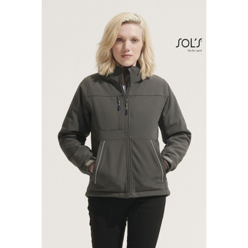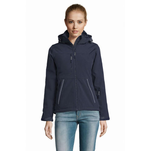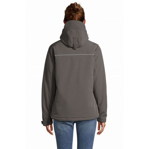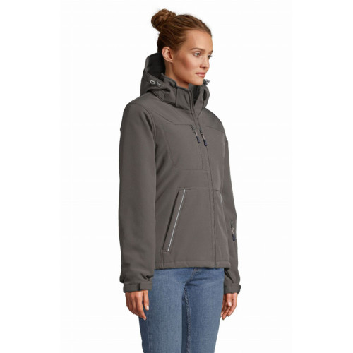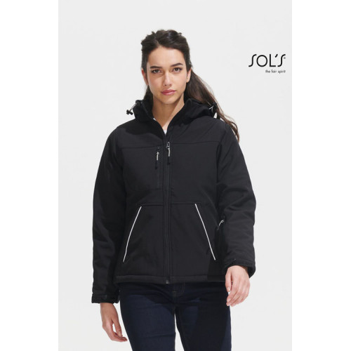 Giacca donna softshell imbottita – softshell 340 - Prodotto che unisce tecnica e design. Conferisce calore e confort a chi lo indossa, pur restando leggero. Destinato a tutti i tipi di mercato. – Softshell invernale interamente imbottito Cappuccio con visiera alta visibilità removibile e regolabile mediante cordino elastico con ferma cordino Velcro® 3 tasche sul davanti con zip 1 tasca manica sinistra con zip 1 tasca interna con zip 1 tasca interna in rete Polsini regolabili con Velcro® e polsini interni elastici al fondo manica Coulisse regolabile sul fondo del capo Punto vita sfiancato e femminile