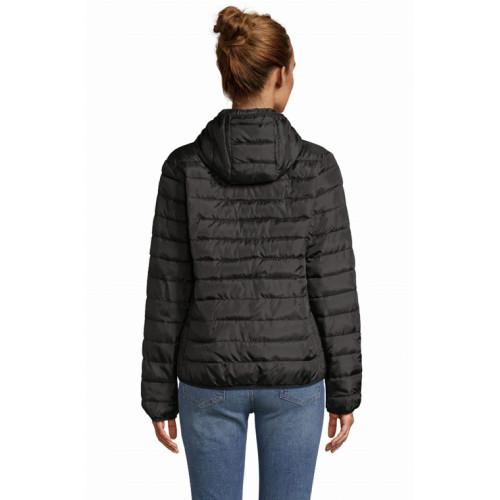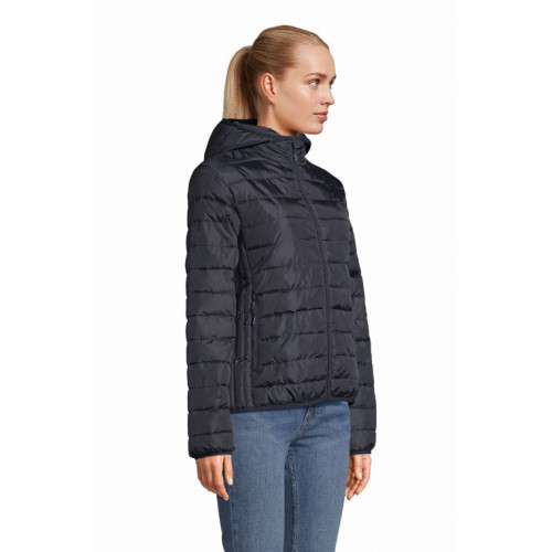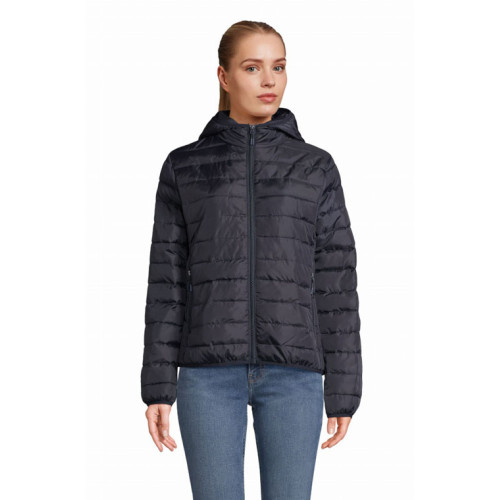 Giacca donna leggero con cappuccio – Chiusura centrale e tasche laterali con zip in nylon tono su tono Cursori metallici tono su tono con tirazip fantasia nero Cappuccio con bordo elasticizzato Fondo e polsini elasticizzati tono su tono