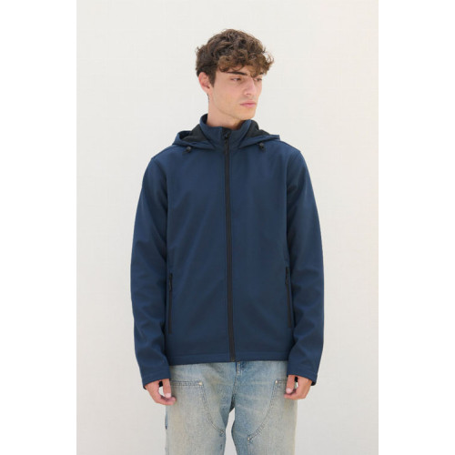 Giacca uomo softshell con cappuccio – Chiusura centrale e tasche laterali con zip in nylon nera Tirazip neri Cappuccio con cordino Schiena leggermente più lunga