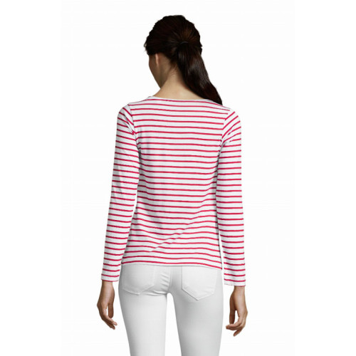 T-shirt donna manica lunga rigata – Capo classico, eterno e sempre alla moda, con le sue eccellenti qualità: il cotone pettinato e le righe intessute. – Collo rotondo Tagliata e cucita Dettagli in chambray su collo