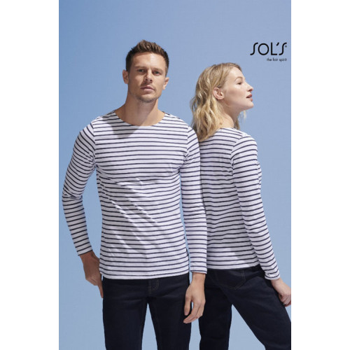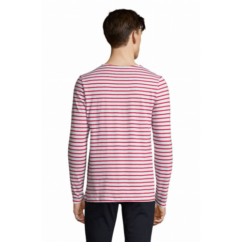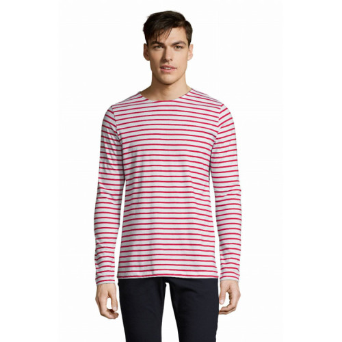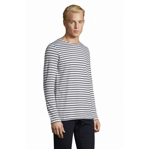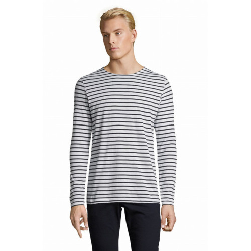 T-shirt uomo manica lunga rigata – Capo classico, eterno e sempre alla moda, con le sue eccellenti qualità : il cotone pettinato e le righe intessute. – Collo rotondo Taglio aderente Tagliata e cucita Dettagli in chambray su collo