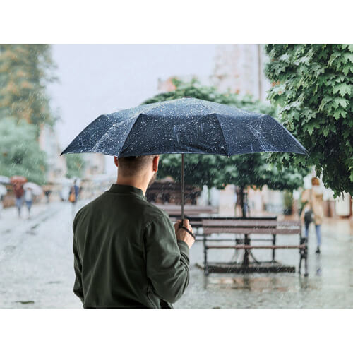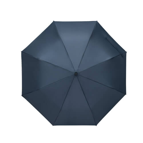 Ombrello pieghevole in pongee 190T PET (100% rPET), progettato per offrire protezione e praticità grazie alla struttura antivento e all’apertura automatica.