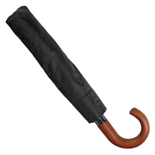 Mini ombrello automatico a pulsante, manico curvo in legno, inserito in guaina. Disponibile in colore nero. Dimensioni articolo 128 cm. Materiale: poliestere.