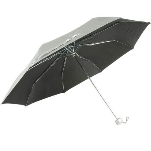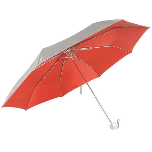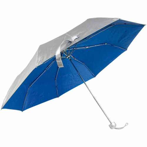 Mini ombrello nylon 190T argentato all'esterno e colorato all'interno (Dia 91 cm.). I colori disponibili dell'interno sono: nero, rosso, blu.