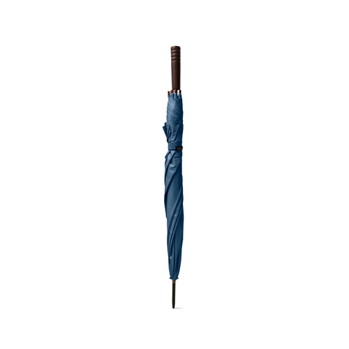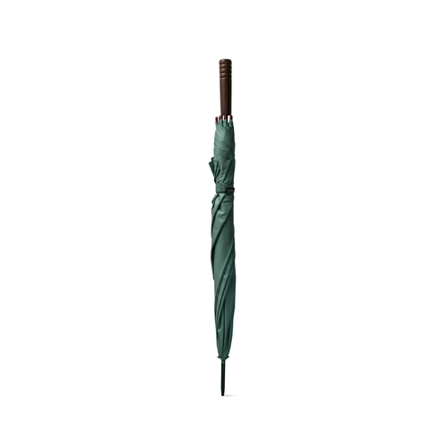 Ombrello in PET pongee realizzato in tessuto 100% rPET, con apertura automatica, struttura in metallo e manico in legno.