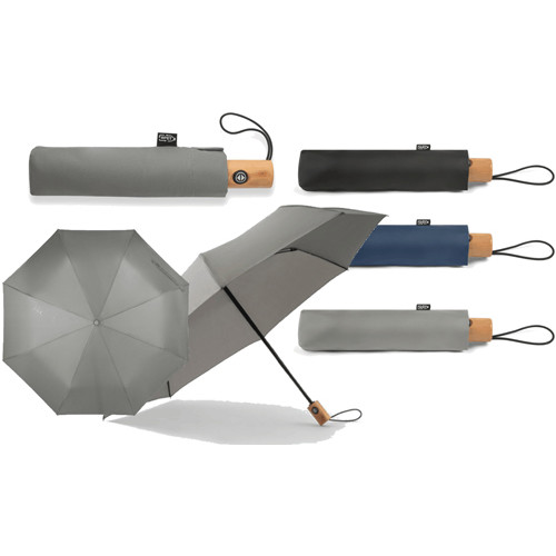Ombrello pieghevole in pongee 190T PET realizzato in tessuto 100% rPET, con stecche in fibra di vetro e manico in legno. Struttura pieghevole in 3 sezioni con apertura e chiusura automatica.