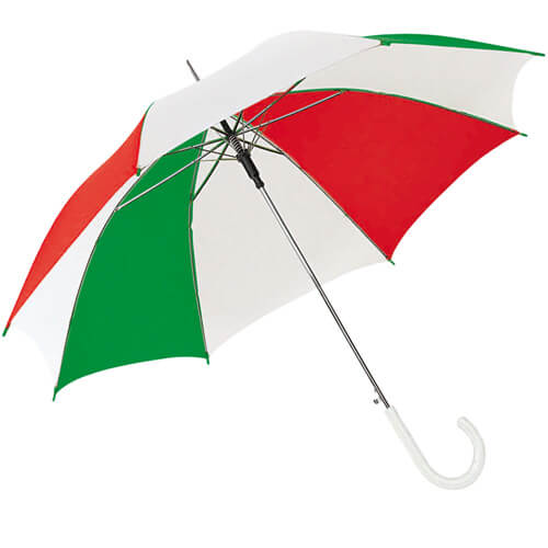 Ombrello automatico con spicchi tricolore, fusto in acciaio e manico curvo in plastica. Dimensione articolo: 102 cm. Materiale poliestere.