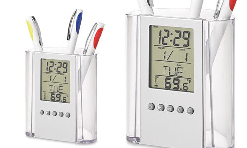 Portapenne con calendario, orologio e termometro. 1 pila bottone inclusa. Dimensioni: 10x5x11,5 cm. Materiale: acrilico.