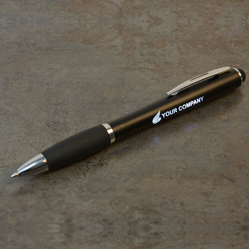 Penna twist in plastica con luce LED, un accessorio elegante e innovativo che illumina il logo inciso al laser sul fusto. Dotata di gommino per touch screen, è perfetta per l'uso quotidiano e come gadget promozionale di grande impatto.