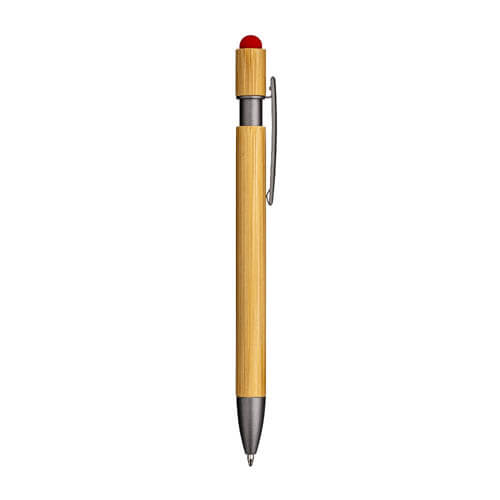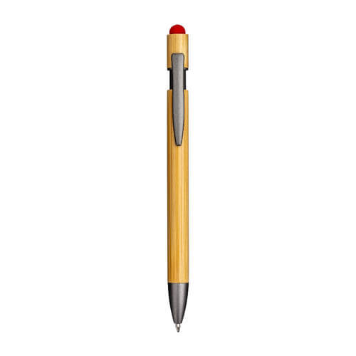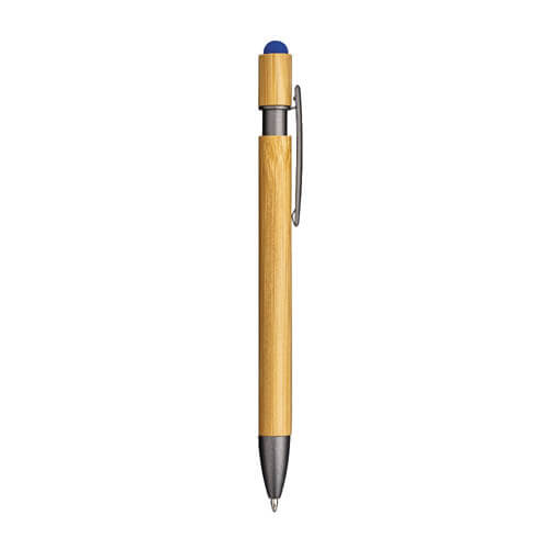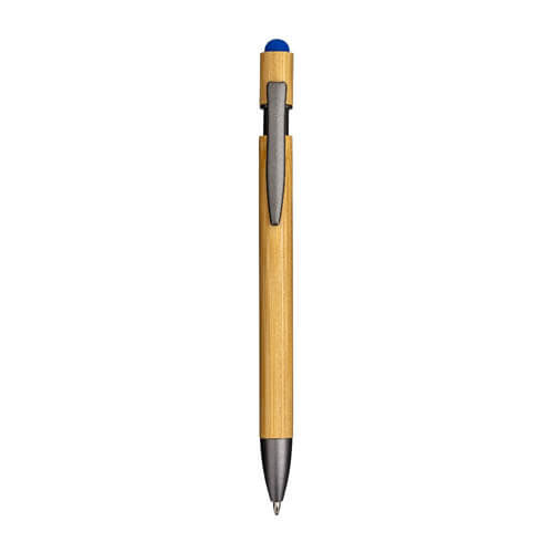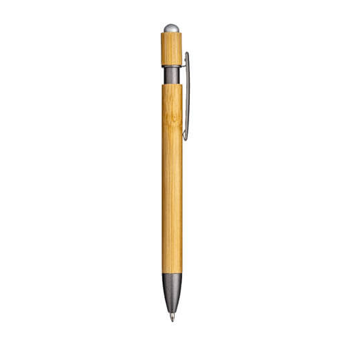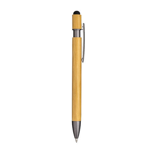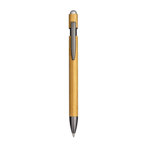 Penna a scatto in bambù e metallo con particolari bruniti e gommino touch screen, unisce eleganza e funzionalità in un design naturale e contemporaneo. Perfetta per l’uso quotidiano e ideale come gadget promozionale eco-friendly di alta qualità per eventi aziendali, fiere o regali corporate.