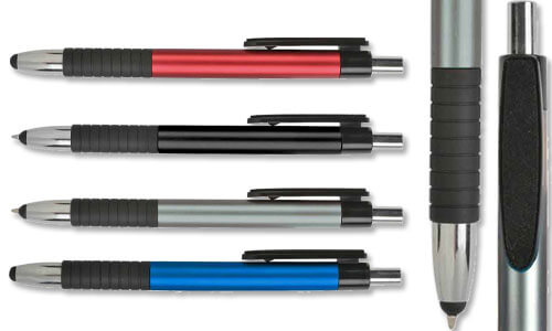 Penna a Scatto in Plastica con Touch Screen e Panno Pulisci Schermo: Questa penna a scatto multifunzionale è dotata di un touch screen e un panno pulisci schermo inserito sulla clip. Presenta finiture nere e un'impugnatura in gomma per un maggiore comfort.