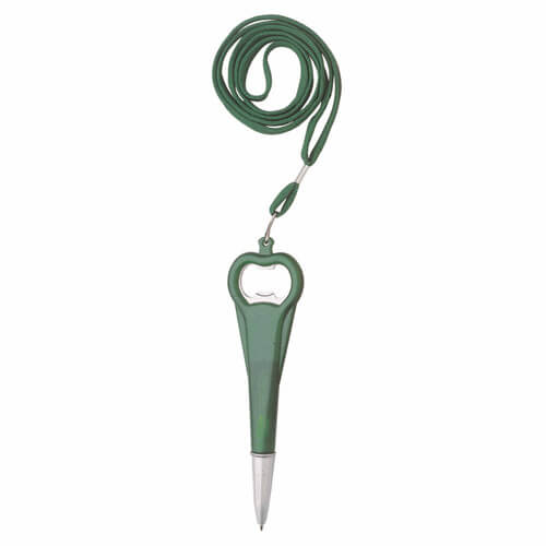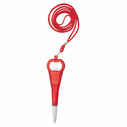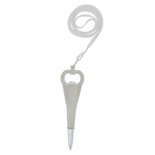 Penna a Sfera Piatta con Cordino da Collo e Apribottiglia: Questa penna a sfera piatta è dotata di un pratico cordino da collo e di un apribottiglia integrato. Il meccanismo a rotazione la rende facile da usare, perfetta per ogni occasione.