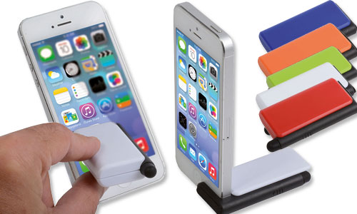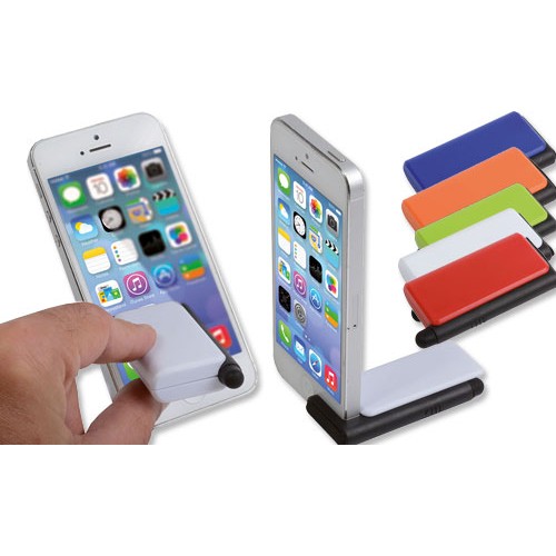 Sostegno per cellulare con touch screen e pulisci schermo. Disponibile nei colori: bianco, rosso, arancio, blu e verde.