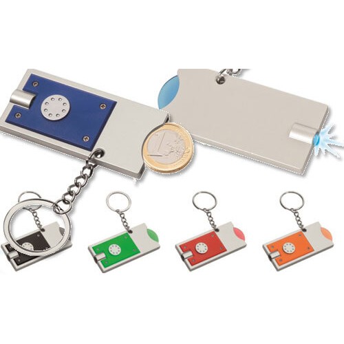 Portachiavi con gettone per carrello e luce. Dimensioni: 6,5x2,8 cm disponibile nei colori: bianco, nero, rosso, verde, giallo, arancione e blu royal.