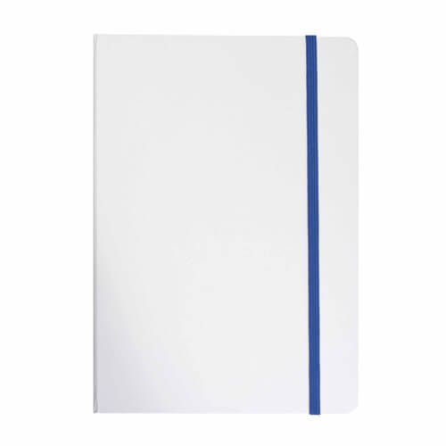 Quaderno bianco con elastico colorato, fogli a righe, (80 pag.) disponibile noi colori: nero, rosso, giallo, arancio, blu royal, azzurro, verde mela. Dimensioni: 14 x 21 cm. segnalibro in raso dello stesso colore dell'elastico, Materiale copertina PU.