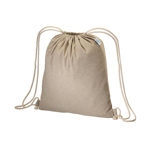 Zainetto in cotone riciclato effetto melange 180 g/m², una scelta ecologica e resistente per il trasporto quotidiano. Grazie alla chiusura a strozzo, garantisce praticità e sicurezza, personalizzabile con loghi e grafiche, rappresenta un’ottima scelta per eventi, fiere e campagne pubblicitarie.