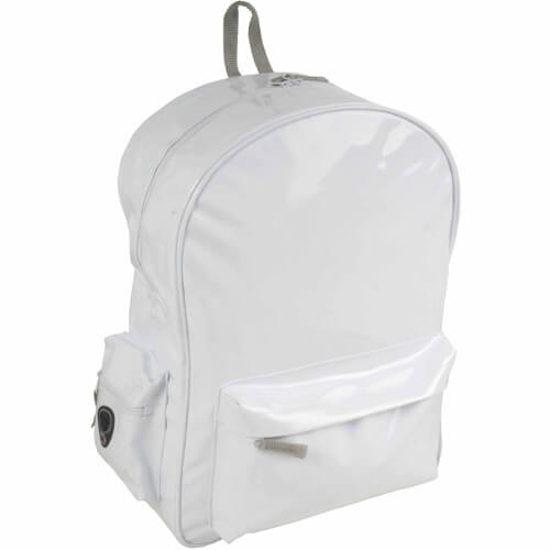 Zainetto in PVC Lucido con 2 Tasche: Questo zainetto elegante e pratico è realizzato in PVC lucido, ideale per un look moderno e alla moda. Dotato di due tasche, una frontale ed una laterale, offre ampio spazio per organizzare e trasportare i tuoi oggetti essenziali.