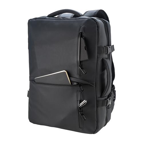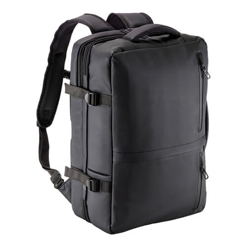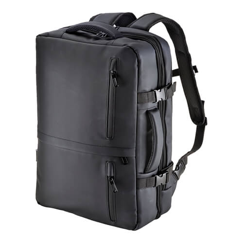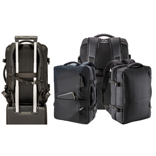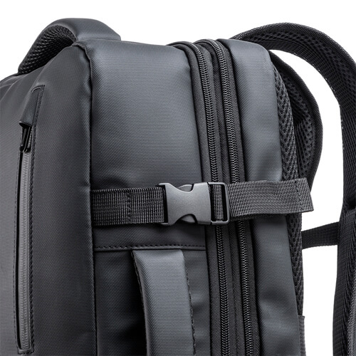 Zaino da viaggio con porta PC realizzato in poliestere 600D con rivestimento in PU water resistant, progettato per il trasporto organizzato di dispositivi e accessori durante gli spostamenti.