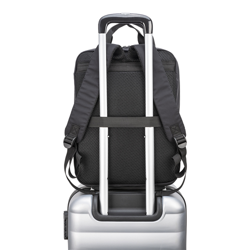 Zaino porta PC 15" in poliestere e nylon 280D con compartimento imbottito per notebook e sistema di aggancio ai trolley.